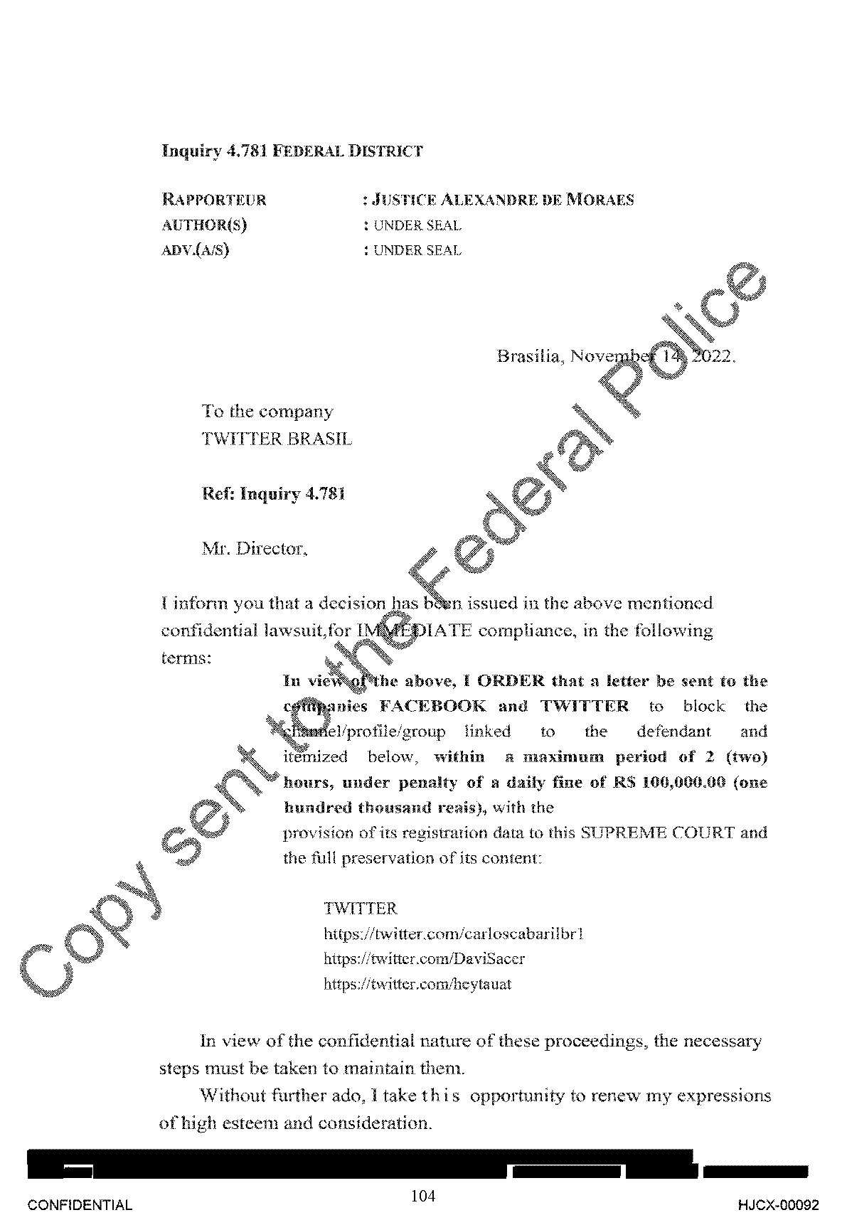 As usual, Moraes’ order contained no reasons and required the censorship of Sacer’s social media accounts within a mere 2 hours, in violation of the… pic.twitter.com/gAD8hUr2Jp