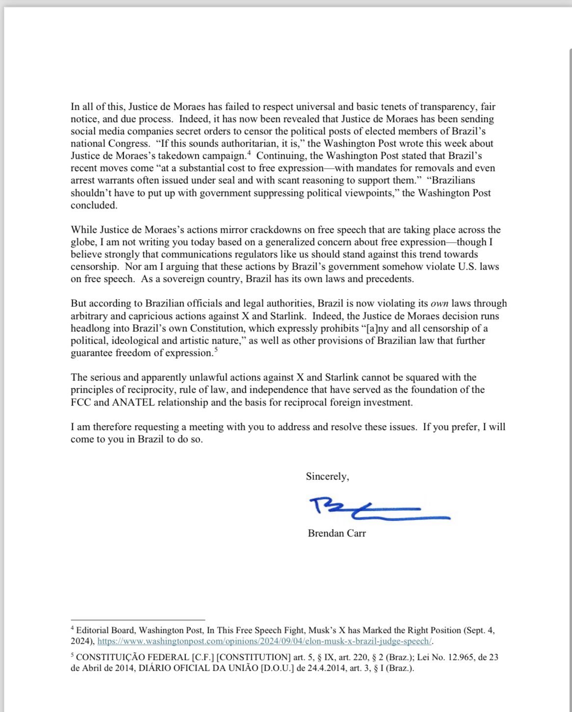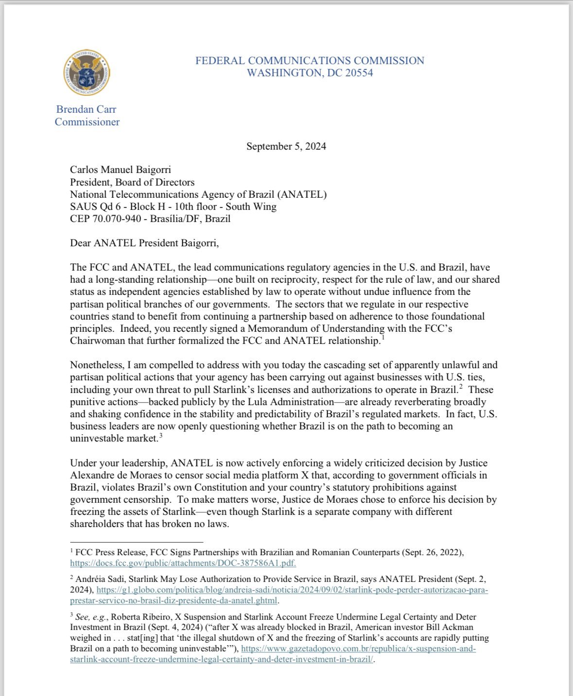 Embora as ações do ministro de Moraes reflitam repressões à liberdade de expressão que estão ocorrendo em todo o mundo, não estou escrevendo a você hoje com base em uma preocupação generalizada sobre a liberdade de expressão — embora eu acredite firmemente que reguladores de comunicações, como nós, devam se opor a essa tendência em direção à censura. Tampouco estou argumentando que essas ações do governo brasileiro violam de alguma forma as leis dos EUA sobre liberdade de expressão. Como país soberano, o Brasil tem suas próprias leis e precedentes. No entanto, de acordo com autoridades e especialistas jurídicos brasileiros, o Brasil agora está violando suas próprias leis por meio de ações arbitrárias e caprichosas contra o X e a Starlink.