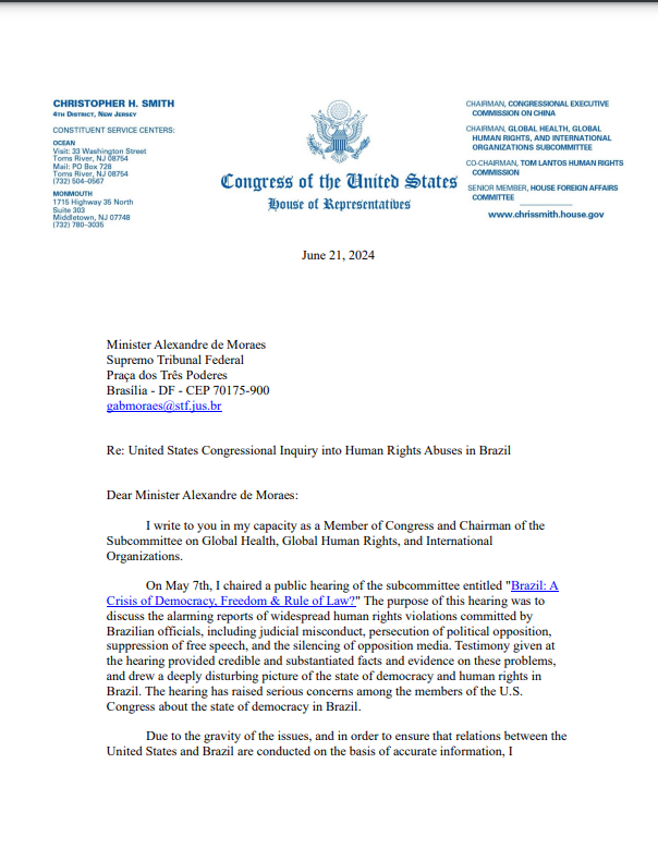 A intimação, enviada pelo congressista Christopher H. Smith, presidente da Subcomissão de Saúde Global, Direitos Humanos Globais e Organizações Internacionais, busca esclarecimentos sobre censura, restrições à mídia, perseguições a parlamentares e violações de devido processo legal, incluindo ações contra indivíduos ou empresas fora da jurisdição brasileira, especialmente nos EUA.