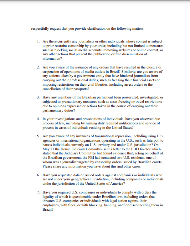 Devido à gravidade das questões, e para garantir que as relações entre os Estados Unidos e o Brasil sejam conduzidas com base em informações precisas, solicito respeitosamente que o senhor forneça esclarecimentos sobre os seguintes assuntos: