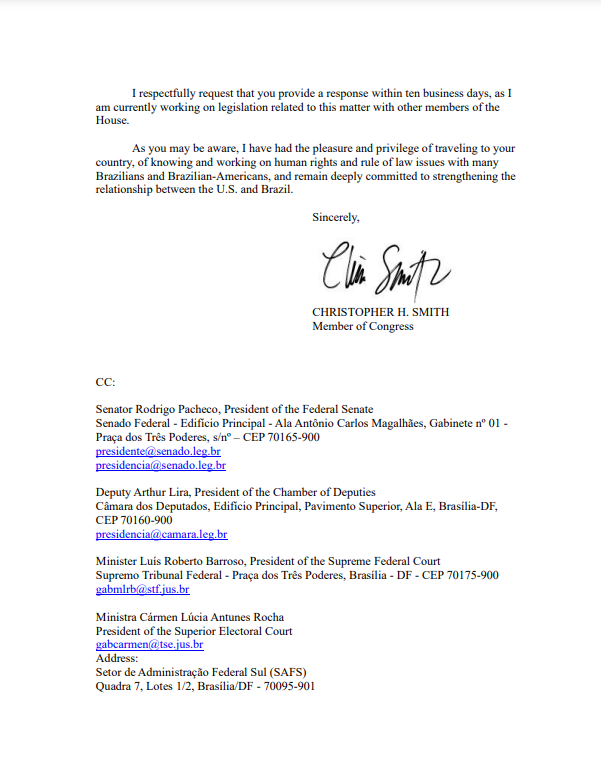 Smith, o congressista mais antigo dos Estados Unidos, conhecido por suas iniciativas contra violações de direitos humanos, ressalta a importância das respostas após uma audiência pública em 7 de maio sobre a crise democrática no Brasil, intitulada “Brasil: Uma Crise de Democracia, Liberdade e Estado de Direito?“. O que trouxe à tona “evidências credíveis” sobre os problemas no país.
