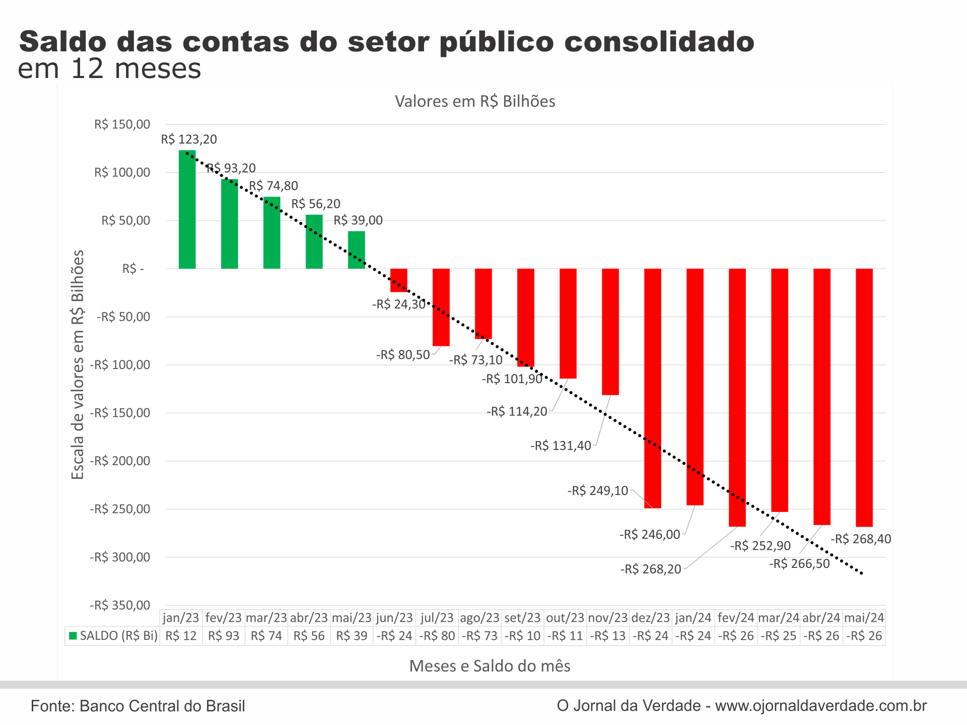 Nos 12 meses até maio, o governo federal registrou um déficit de R$ 268,4 bilhões, representando 2,36% do PIB. As despesas obrigatórias somaram 18,6% do PIB, enquanto as discricionárias do Executivo alcançaram 1,8% do PIB. Para 2024, o governo estabeleceu metas de resultado primário neutro e um limite de despesas fixo em R$ 2,089 trilhões. O Relatório Bimestral de Avaliação de Receitas e Despesas, publicado em maio, projetou um déficit de R$ 14,5 bilhões para o ano, equivalendo a 0,1% do PIB.