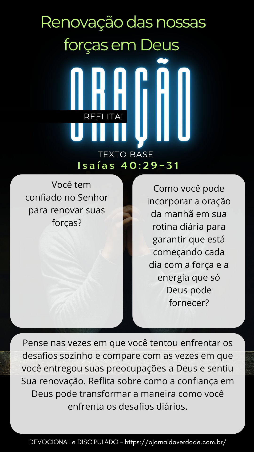 Reserve um momento para pensar sobre essas questões durante o seu dia. Pense nas vezes em que você tentou enfrentar os desafios sozinho e compare com as vezes em que você entregou suas preocupações a Deus e sentiu Sua renovação. Reflita sobre como a confiança em Deus pode transformar a maneira como você enfrenta os desafios diários.