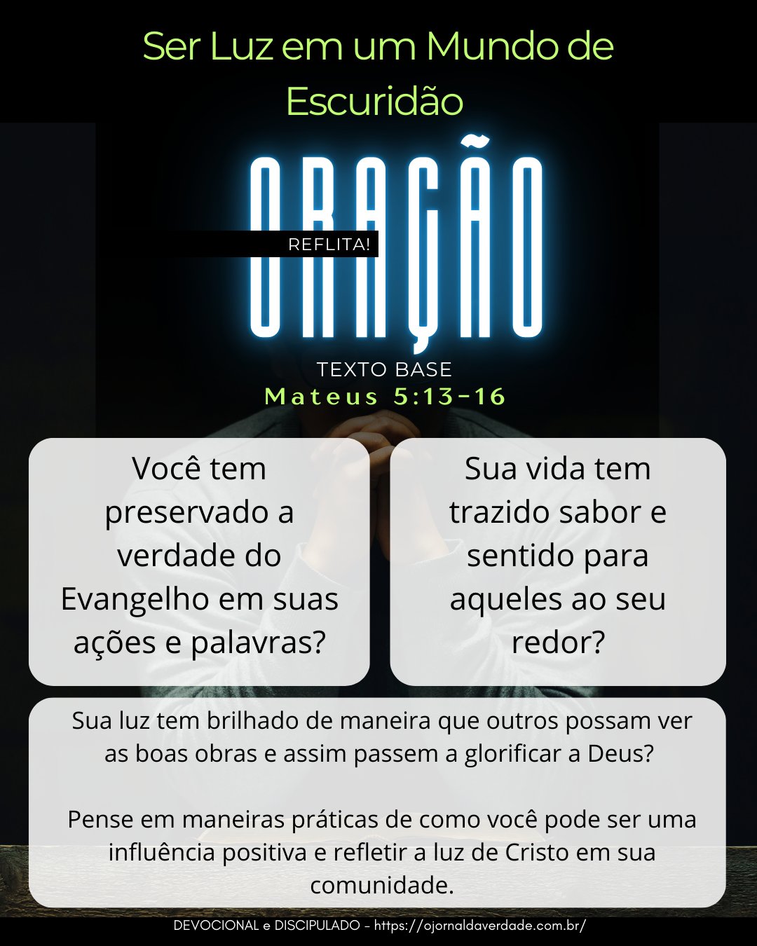 Reserve um momento para pensar sobre essas questões durante o seu dia. Pense em maneiras práticas de como você pode ser uma influência positiva e refletir a luz de Cristo em sua comunidade.