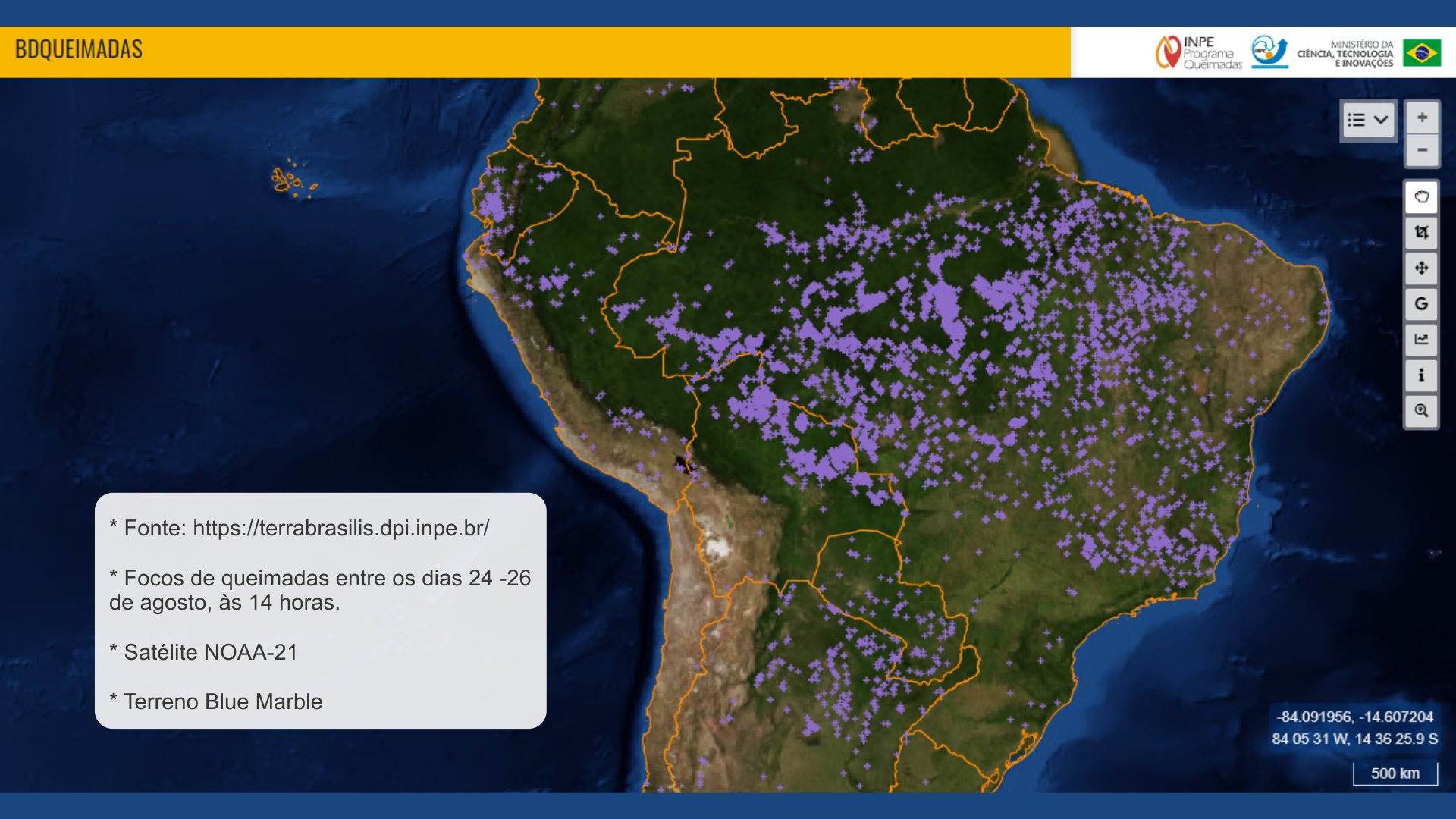 De acordo com o Instituto Nacional de Pesquisas Espaciais (Inpe), entre 1º de janeiro e 23 de agosto de 2024, foram registrados mais de 102.670 focos de queimadas no Brasil, o maior número dos últimos 14 anos. Desde 2010, quando 114.265 focos foram registrados, não havia tantas queimadas neste período no país. A Amazônia Legal é responsável por mais da metade desses focos. Além disso, a área queimada neste ano é a maior da série histórica iniciada em 2003, com 113.677 km² de vegetação destruída até julho de 2024.